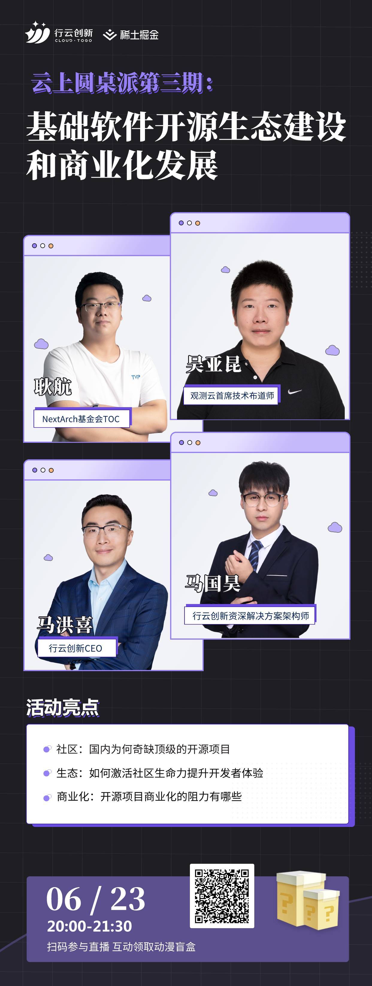 6月23日晚上20:00,云上圆桌派第三期《基础软件开源生态建设和商业化发展》即将开启,活动邀请NextArch基金会TOC耿航,观测云首席技术布道师吴亚昆,米兰milan创新资深解决方案架构师马国昊三位大咖和米兰milan创新CEO马洪喜一起对国内的开源生态现状、社区的建设及商业化发展等多个问题一起展开讨论。